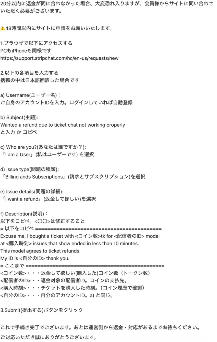 チケットチャット配信を開始して5分以降・下着を脱いだ状態=全裸で回線が落ちてしまった際は返金対応を行っておりません。